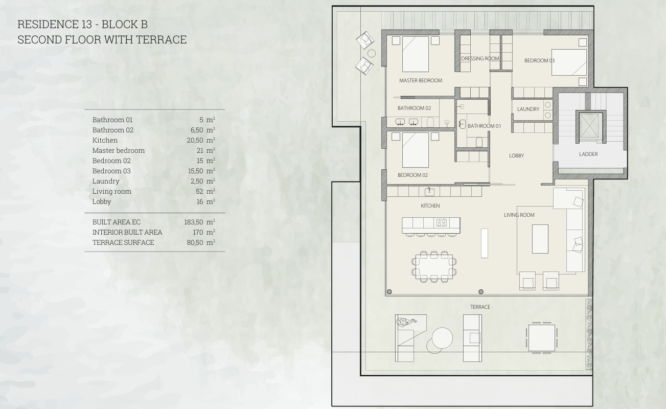 House > Block B > Residence 013 013 A Masterpiece of Architecture Second FloorPrice: 2.680.000€. Rooms 3 Bathrooms 2 Surface 183,50 m2 Terrace 80,50 m2 Rooms 3 Bathrooms 2 Surface 183,50 m2 Terrace 80,50 m2 Residence 013 Want to know more? Request more information Consult the plans See plansBuilding specifications