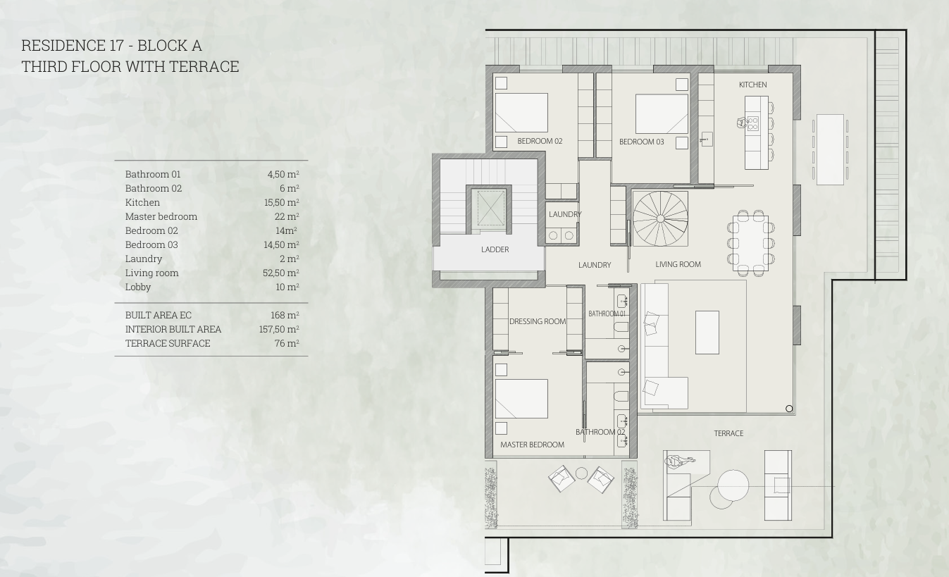 House > Block A > Residence 017 017 A Masterpiece of Architecture Third FloorPrice: 2.980.000€. Rooms 3 Bathrooms 2 Surface 168 m2 About attic 126,5 m2 Terrace 76 m2 Rooms 3 Bathrooms 2 Surface 168 m2 About attic 126,5 m2 Terrace 76 m2 Residence 017 Want to know more? Request more information Consult the plans See plansBuilding specifications