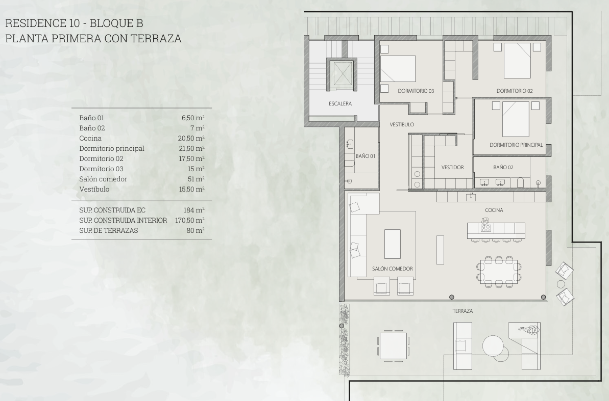 Home > Bloque B > Residence 010 010 Una Pieza Maestra de la Arquitectura Planta 1Precio: 2.330.000€ Habitaciones 3 Baños 2 Superficie 184 m2 Terraza 80 m2 Habitaciones 3 Baños 2 Superficie 184 m2 Terraza 80 m2 Residence 010 ¿Quieres saber más? Pedir más información Consulta los planos Ver planosMemoria de calidades