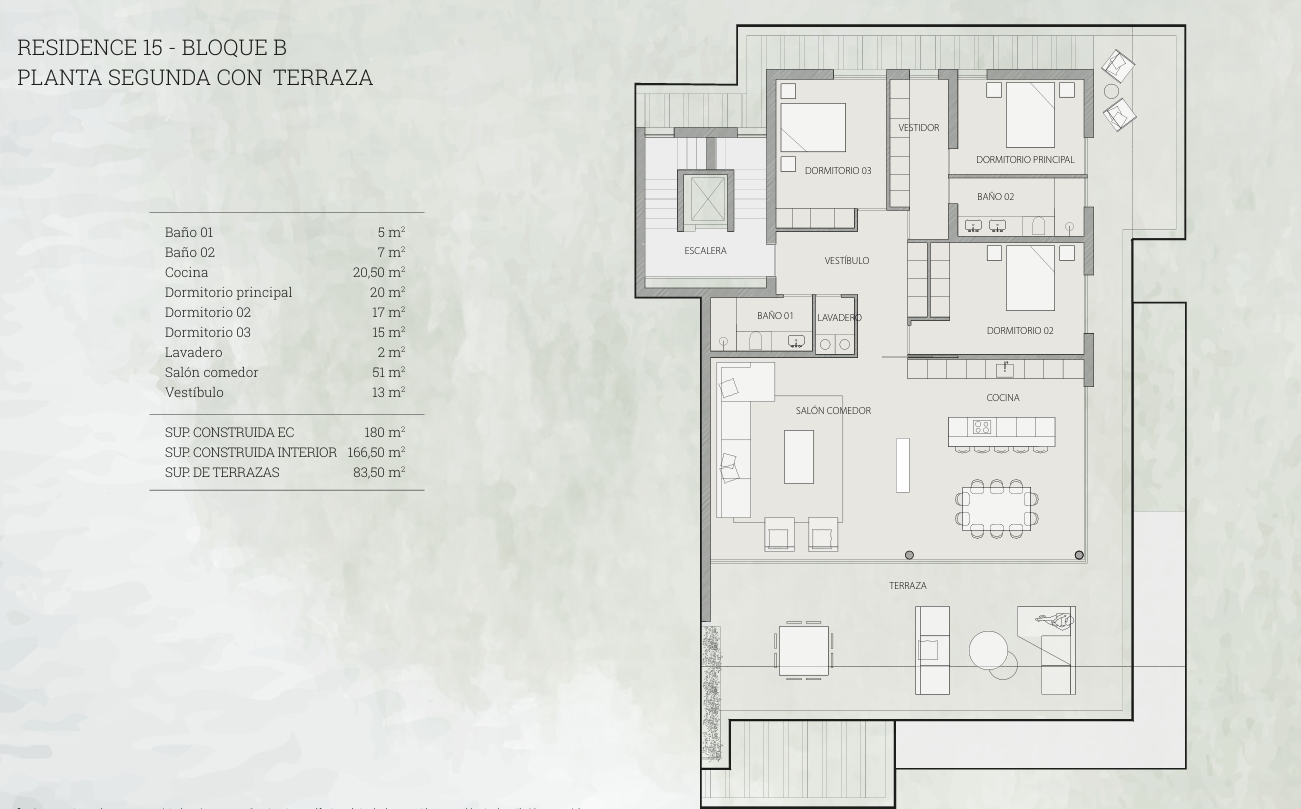 Home > Bloque B > Residence 07 015 Una Pieza Maestra de la Arquitectura Planta 2Precio: 2.680.000€ Habitaciones 3 Baños 2 Superficie 180 m2 Terraza 83,50 m2 Habitaciones 3 Baños 2 Superficie 180 m2 Terraza 83,50 m2 Residence 015 ¿Quieres saber más? Pedir más información Consulta los planos Ver planosMemoria de calidades