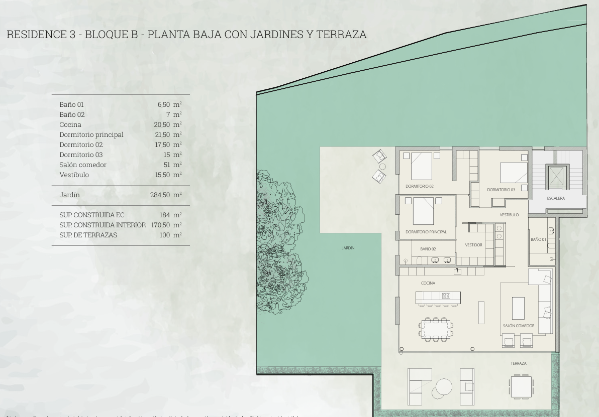 Home > Bloque B > Residence 03 03 Una Pieza Maestra de la Arquitectura Planta BajaPrecio: 1.980.000€ Habitaciones 3 Baños 2 Superficie 184 m2 Terraza 100 m2 Jardín 284,50 m2 Habitaciones 3 Baños 2 Superficie 184 m2 Terraza 100 m2 Jardín 284,50 m2 Residence 03 ¿Quieres saber más? Pedir más información Consulta los planos Ver planosMemoria de calidades