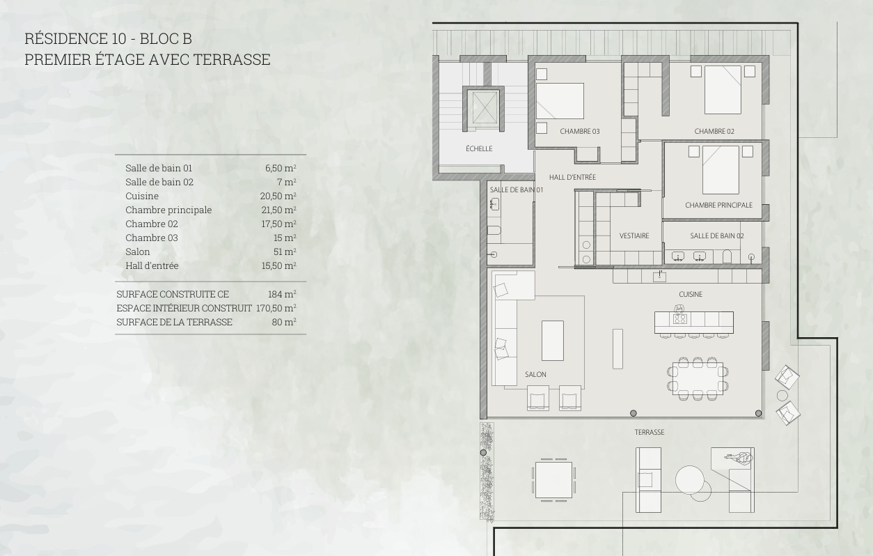 Accueil > Bloc B > Résidence 010 010 Un chef-d'œuvre d'architecture Etage 1Prix : 2.330.000€ Chambres 3 Toilettes 2 Surface 184 m2 Terrasse 80 m2 Chambres 3 Toilettes 2 Surface 184 m2 Terrasse 80 m2 Résidence 010 Vous voulez en savoir plus ? Demander plus d'informations Consulter les plans Voir les plansSpécifications des bâtiments