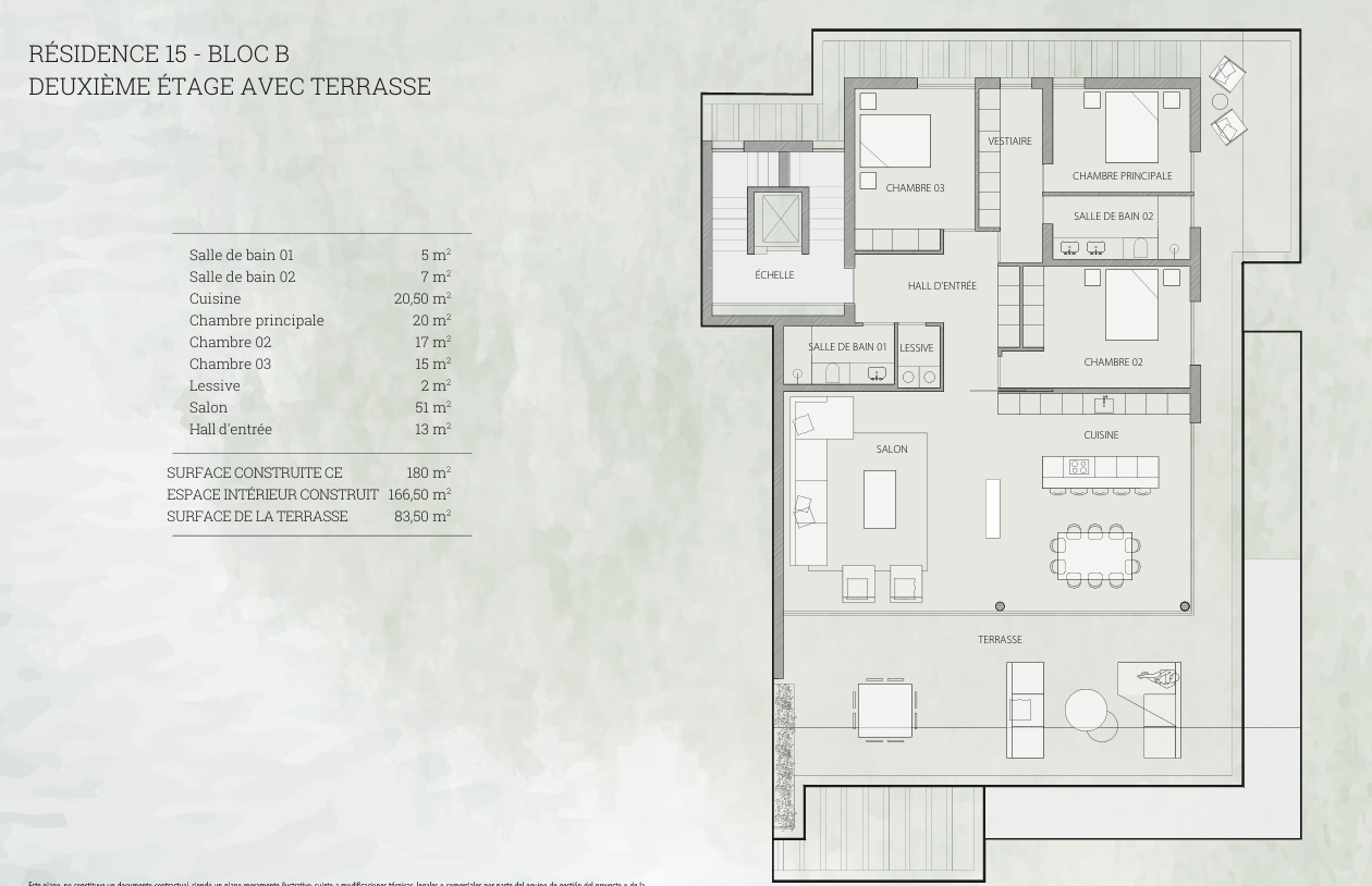 Accueil > Bloc B > Résidence 07 015 Un chef-d'œuvre d'architecture Etage 2Prix : 2.680.000€ Chambres 3 Toilettes 2 Surface 180 m2 Terrasse 83,50 m2 Chambres 3 Toilettes 2 Surface 180 m2 Terrasse 83,50 m2 Résidence 015 Vous voulez en savoir plus ? Demander plus d'informations Consulter les plans Voir les plansSpécifications des bâtiments
